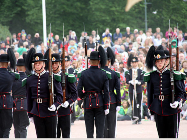 The King and the Queen are both celebrating their 75th birthdays this year, and yesterday the festivities started with a performance by the Royal Guard Norwegian Military Drill Team and the singing of the Norwegian birthday song in the Palace Square. Each year on Norwegian Constitution Day on May 17th, schoolchildren march through the Palace Square in the customary children’s parade. Yesterday it was the pre-schoolers’ turn to fill the square, where they were served juice and buns and watched the drill team perform, before they gave a rousing rendition of Norway’s traditional birthday song.