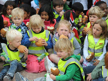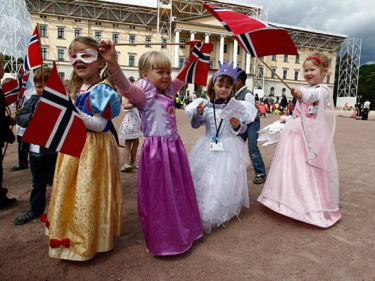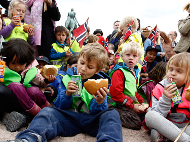 The City of Oslo treated the children to the customary birthday fare of buns and juice, and the members of the Royal Court had the pleasure of handing them out. They had to return to the Palace several times to replenish their baskets before all of the children had received their goodies.