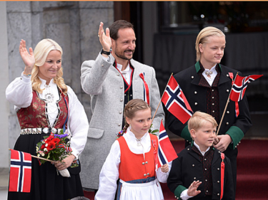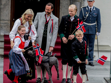 The Crown Prince and Crown Princess and their family started the day at Skaugum Estate, where they greeted the Asker municipality Childrens parade early this morning.