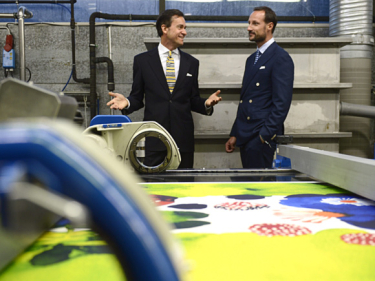 On Wednesday, Crown Prince Haakon paid a visit to the headquarters, where the companys director Mika Ihamuotila gave the Crown Prince a tour of the textile printing facility. Large, bold prints are a hallmark of Marimekkos textile design.