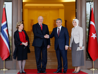 The King and Queen were formally welcomed to Turkey by their hosts, President Abdullah Gül and Mrs Hayrünnisa Gül, at the Cankaya Presidential Palace in Ankara. After the national anthems of both countries were played, King Harald and President Gül inspected the Honour Guard before the delegations were presented.