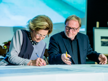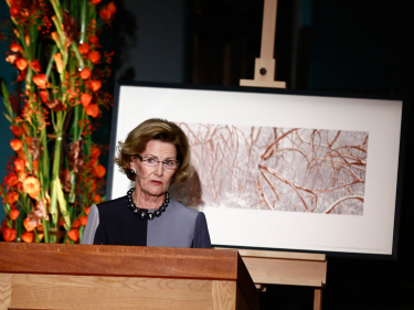 Queen Sonja and Ørnulf Opdahl presented new works of graphic art developed in collaboration with ULAE in New York. In the US, there is a widespread tradition of inviting artists to do a signing. The Queen and Mr Opdahl signed their new prints on the stage at the National Gallery event this evening.