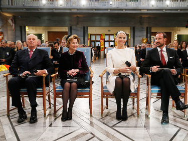 In the evening, King Harald, Queen Sonja, Crown Prince Haakon and Crown Princess Mette-Marit were in attendance at the traditional banquet held at the Grand Hotel in Oslo in honour of the Nobel Peace Prize Laureates.