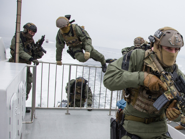 This morning, the King and Queen accompanied President Bērziņš on board the MS Baronen for a trip on the Oslo Fjord. In the middle of the fjord the catamaran was stormed by soldiers from the Naval Special Operations Command and the Norwegian Special Forces Command, who demonstrated how they take control over a vessel.