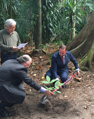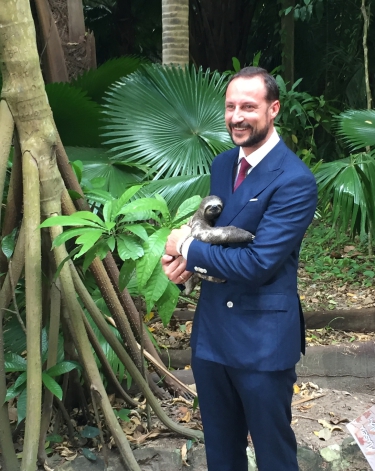 Following the seminar, Crown Prince Haakon visited the zoological park and botanical garden surrounding the museum. As the Crown Prince strolled through the grounds he was given more information about the museum’s collaborative activities with Norwegian research groups. The Crown Prince planted a local variety of tree known as Pequiá in the garden. He also had a close encounter with some of the area’s special fauna - a drowsy baby sloth had no objection to being carried by a crown prince.