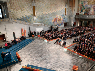 In a musical start to the ceremony, soprano Lise Davidsen sang Edvard Grieg’s Ved Rondane with accompaniment of Håvard Gimse on the piano. After the performance, Kaci Kullman Five, Chair of the Norwegian Nobel Committee, welcomed the guests and recapitulated the committee’s decision.