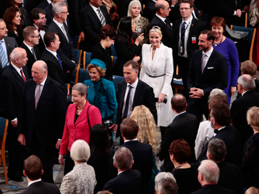 Earlier in the day, King Harald received the Peace Prize Laureates in an audience at the Royal Palace. Queen Sonja, Crown Prince Haakon and Crown Princess Mette-Marit were in attendance during the audience, which in keeping with tradition also included official photographs taken in the Bird Room.