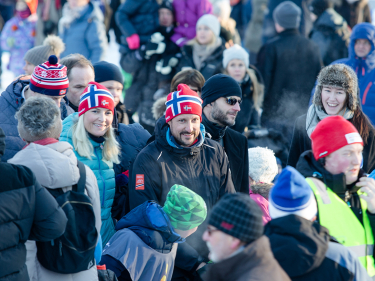 After the church service, the Royal Family came out to the Palace Square to greet some of the several thousand celebrants gathered there and to sample the activities themselves. Her Majesty The Queen donned her cross-country skis and tested the ski trails in the park, together with Their Royal Highnesses The Crown Prince and Crown Princess and Her Royal Highness Princess Ingrid Alexandra. The Crown Prince and Crown Princess and their family tried the ice slide and biathlon with laser rifles as well.