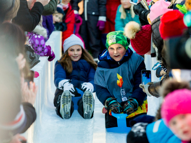 At the same time, the celebration in the Palace Square began with a wide range of winter activities for children and young people. This was the kind of celebration that King Harald and Queen Sonja had asked for, and the Norwegian Olympic and Paralympic Committee and Confederation of Sports rose to the challenge. The event featured cross-country ski trails, hills for snowboarding and ski jumping, an ice slide and areas for ski play. It was also possible to try biathlon with laser rifles.