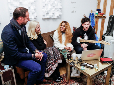 At the by:Songs camp, the Crown Prince and Crown Princess had the chance to meet musical performers and songwriters at work. Among the Norwegian participants are Ina Wroldsen and Andreas Schuller (Axident). Ms Wroldsen has collaborated on hits for celebrated performers such as Calvin Harris, Clean Bandit, Britney Spears and One Direction, while Mr Schuller has a BRIT Award for his work with Little Mix and a Grammy nomination with Justin Bieber.
