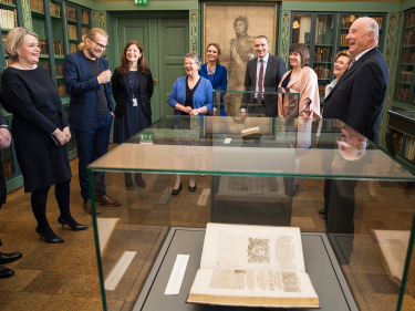 Following the visit to Oslo Science Park, Director General Aslak Sira Myhre welcomed the President and First Lady of Iceland and the King and Queen to the National Library of Norway. The Sagas of Icelanders were the focus of the visit.