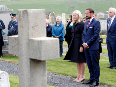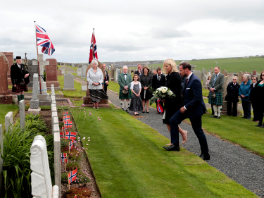St Olaf Cemetery in Kirkwall is the final resting place of thirteen Norwegian seamen who died during the war. Members of a Norwegian special force who died when their plane crashed outside Kirkwall are also buried there. The cemetery was the first stop on the Crown Prince and Crown Princess’s programme today.