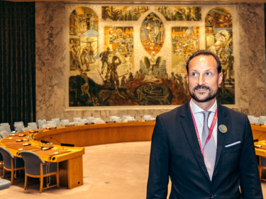 Crown Prince Haakon, together with representatives of a number of countries, also visited the chamber where the Security Council meets. Norway donated the chamber to the UN in 1952. The “world’s most important room” was designed by Norwegian architect Arnstein Arneberg. Artist Per Krohg painted the oil canvas that provides the iconic backdrop for the meeting table, while Else Poulsson designed the wall textiles woven by Joh Petersen Linvarefabrikk.