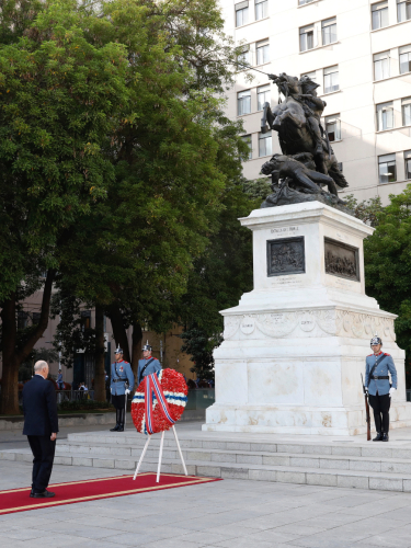 King Harald laid a wreath at the monument commemorating Chile’s founding father, Bernardo O'Higgins. Photo: Heiko Junge, NTB scanpix