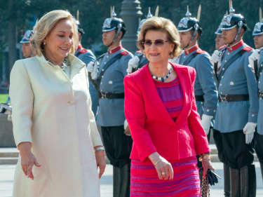 The welcoming ceremony itself took place outside the presidential palace, La Moneda. There the King and Queen were greeted by President Piñera and the First Lady of Chile, Cecilia Morel Montes. King Harald inspected the honour guard before the national anthems of both countries were played.