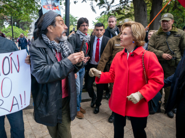 The King and Queen stopped to speak with the Chileans protesting Norwegian aquaculture. Photo: Heiko Junge, NTB scanpix
