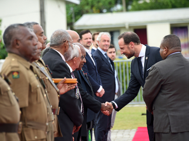 In relation to its population, no country has contributed more to the UN peacekeeping forces than Fiji. Today, 680 members of the Fijian military serve in UN forces, including those in South Sudan and Iraq. Norwegian UN soldiers have served alongside soldiers from Fiji, including in Lebanon, and today Crown Prince Haakon had the chance to greet some of Fiji’s veterans. The meeting took place in conjunction with Crown Prince Haakon’s laying of a wreath at the National War Memorial this afternoon.