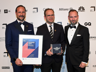 Crown Prince Haakon presented the Special Prize to the Yara Birkeland project, the world’s first autonomous, zero-emission container ship. Starting in 2020 the Yara Birkeland will be in operation in Norway between Yara’s fertiliser plant in Porsgrunn and the ports of Larvik and Brevik.
