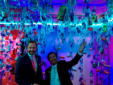 Crown Prince Haakon and Palau's President Tommy Remengesau in the reception's entryway - decorated with bottles and cans collected from Manhattan’s East River. Palau and Norway co-hosted the reception with Portugal, Chile and Kenya. Photo: Norway’s Mission to the United Nations.