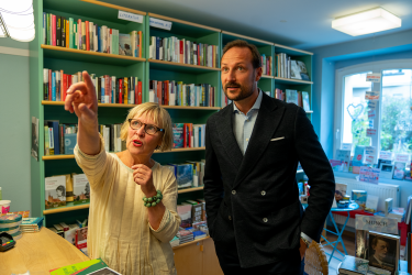 The Crown Prince and Crown Princess were given a tour of the book shop and a presentation of the selection of works, as well as what the owners are doing to expand the focus on Nordic literature.