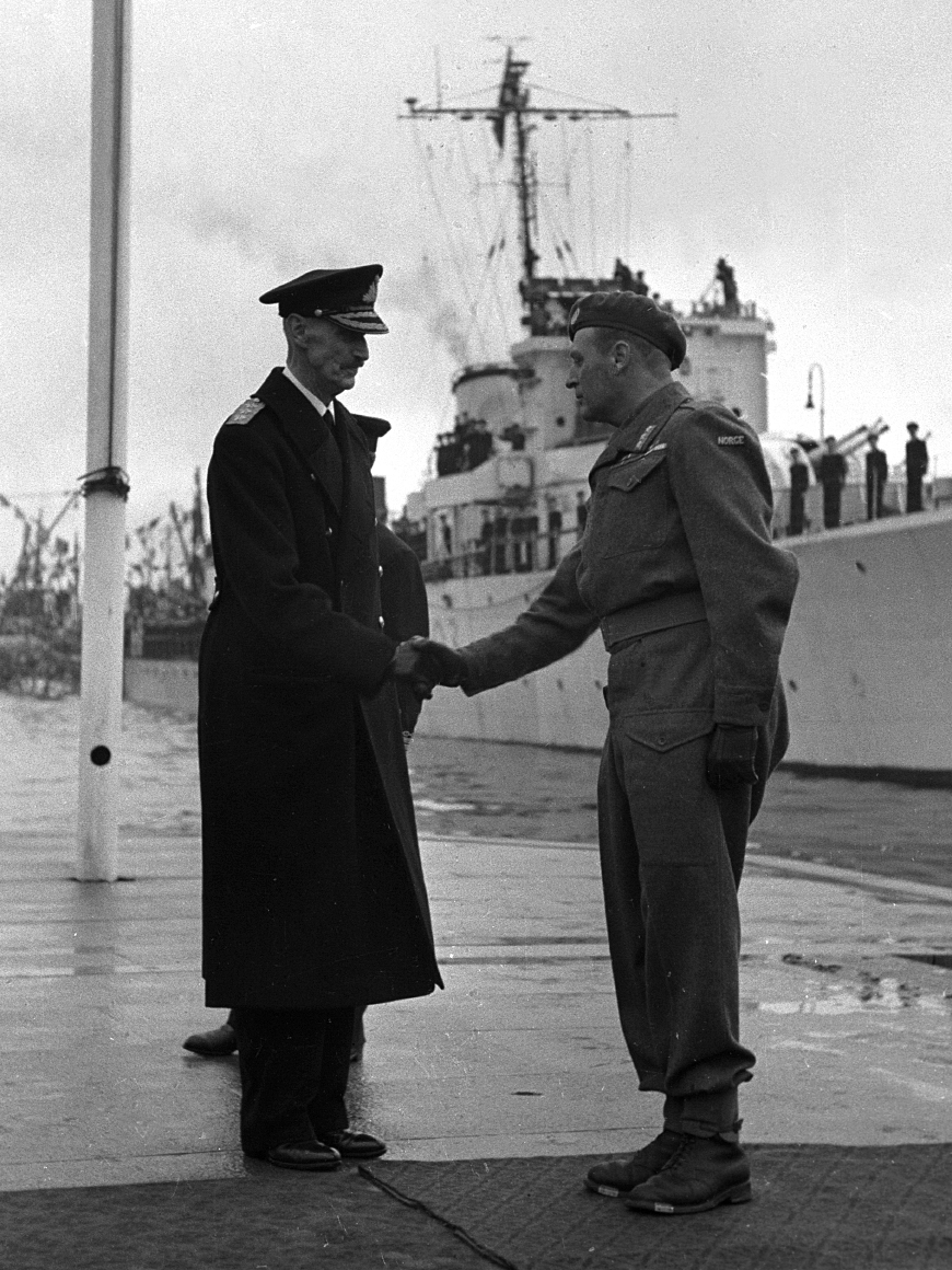 On 5 June 1945, King Haakon boarded HSE Norfolk in Edinburgh to the strains of the Norwegian anthem Ja, vi elsker dette landet. Thus began the trip home to Norway. Photo: Royal Navy official photograph (UK).
