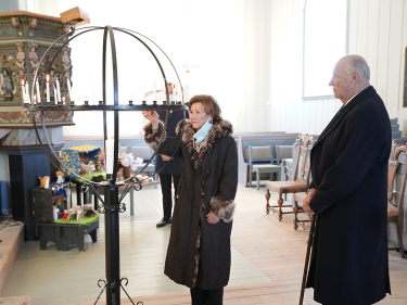 King Harald, Queen Sonja and Crown Prince Haakon were met by Bishop Atle Sommerfeldt outside Gjerdrum church. After entering, they lit candles for those affected by the disaster.