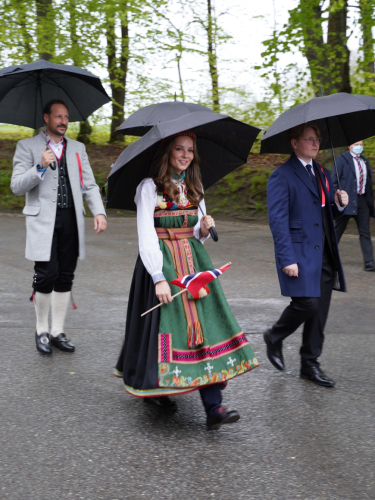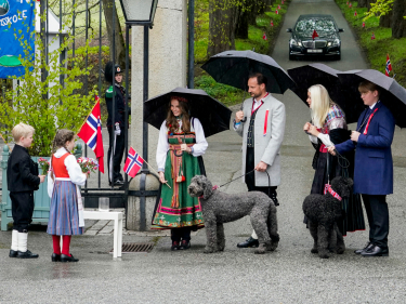 Traditionally the Crown Prince and Crown Princess and their family greet the Asker municipality children’s parade from the steps outside Skaugum Estate on May 17th. Today, however, they walked down the tree-lined driveway to the front gate to greet representatives of the municipal schools, as well as members of the local choirs, marching bands and scout troops.