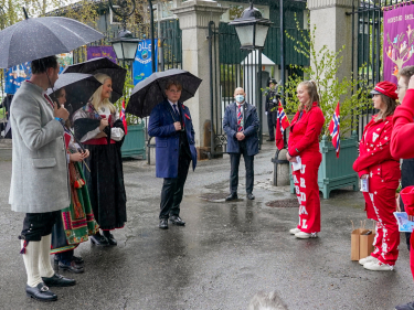 At 12 noon, the Norwegian national anthem was sung. The Norwegian Girls’ Choir led the singing together with Bislett Boy’s Choir, Bolteløkka Girls’ Choir and His Majesty The King’s Royal Guard’s Military Marching Band. The celebration in front of the Palace included speeches, a presentation of some reflections from young people, a drill exhibition, and song and dance performances.