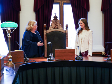 At the Office of the President of the Storting, the Princess met the First Vice President of the Storting, Svein Harberg, and the youngest Member of Storting, Maren Grøthe. Mr Harberg described the work carried out in the various committees, while Ms Grøthe spoke about what it was like to be a member of parliament.