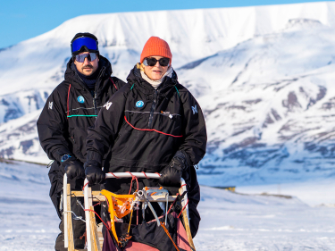The Crown Prince and Crown Princess drove a dog team on a visit to Arctic Husky Travellers outside Longyearbyen. Photo: Ole Berg-Rusten / NTB