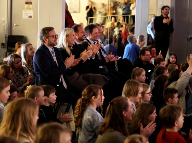 About 170 pupils gathered with the Crown Prince and Crown Princess to see performances in the school’s assembly hall. Youngsters from all levels of the school contributed. Photo: Sara Svanemyr, The Royal Court