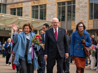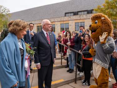 President David Anderson of St. Olaf College and hundreds of students welcomed the Queen. Photo: Simen Løvberg Sund, The Royal Court