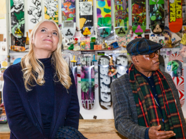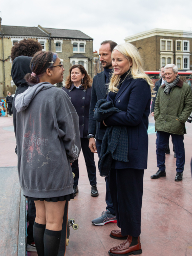 Access to meeting places is a crucial part of bringing people together and creating strong local communities. This afternoon, the Crown Prince and Crown Princess visited Stockwell Skatepark in the Brixton district and met some of the young skaters who gather there. The skatepark, one of the UK’s oldest, was restored by the Norwegian company Betongpark.