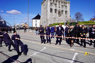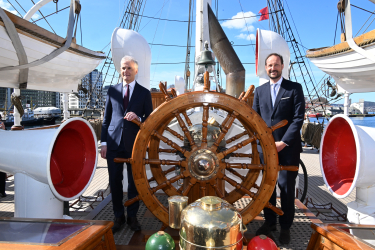On board the three-masted sailing vessel Statsraad Lehmkuhl, which returned to Bergen on 15 April after 20 months at sea, the Crown Prince attended a lunch and talked with a variety of guests, including the biologist Sylvia Earle and Espen Barth Eide, the Norwegian Minister of Climate and Environment.