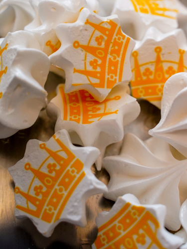 A birthday cake at each table – sponge cake filled with strawberry jam and covered with vanilla mousse and white chocolate, then topped with Norwegian berries and meringues bearing a crown emblem. Photo: Liv Anette Luane, The Royal Court