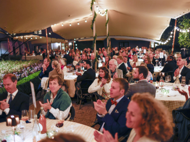 Under party tents to protect against rain, the guests were seated at 48 tables surrounded by an abundance of flowers, live plants and potted trees.