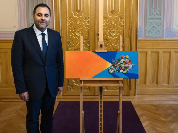 President of the Storting Masud Gharahkhani with the gift for Prince Sverre Magnus' 18th birthday. As a gift from the Storting, the Prince received a painting by the artist Cassius Fadlabi. Photo: Peter Mydske / Stortinget / NTB
