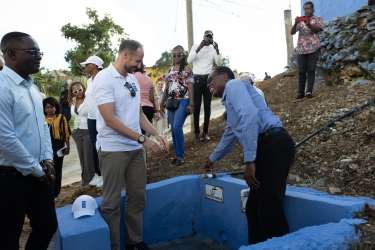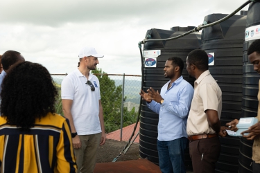 A water harvesting system supported by UNDP ensures easier access to clean drinking water for the residents of the mountain village of Victoria. The Crown Prince saw how the local community manages the chlorination and maintenance of the water tanks themselves.