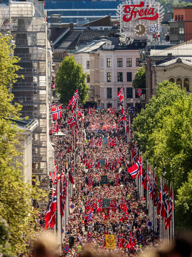 The Royal Family was in attendance on the Palace Balcony when the children's parade reached the Palace Square at 10:30 this morning. From there, they could greet more than 26,000 children from 109 schools taking part in Oslo's children's parade this year.