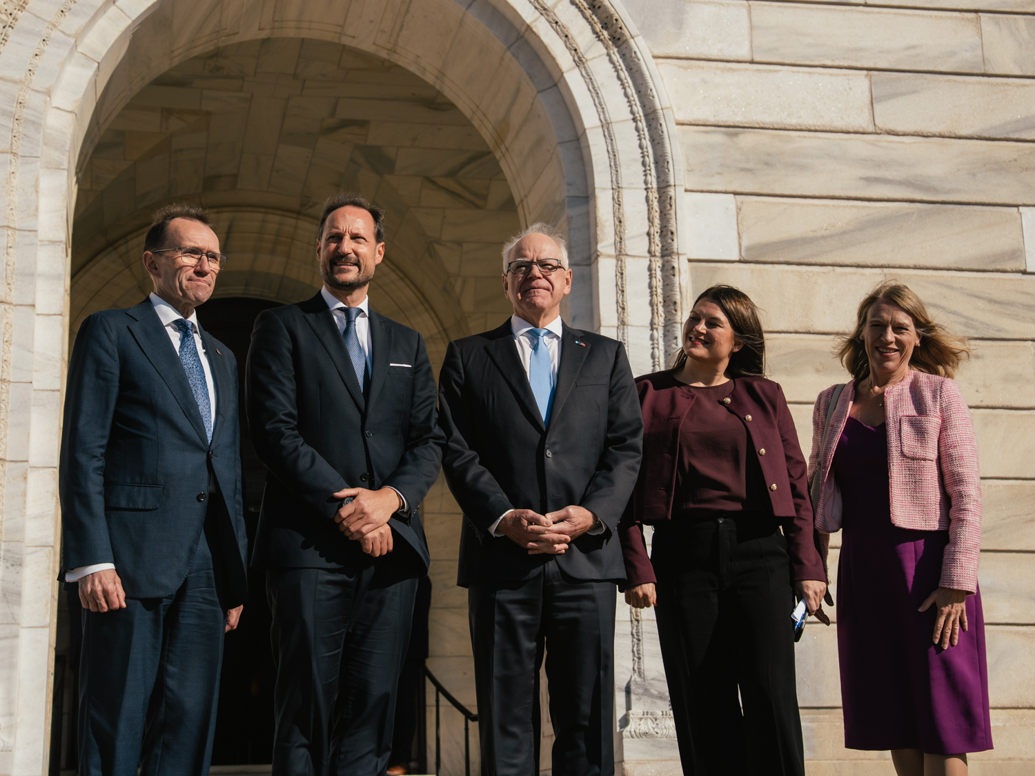 Crown Prince Haakon, along with Ambassador Anniken Huitfeldt, Minister of Foreign Affairs Espen Barth Eide, and Minister of Trade and Industry Cecilie Myrseth outside the Minnesota State Capitol. Photo: Ola Vatn, The Royal Court