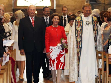 At the Stavanger Cathedral, the Royal party was greeted by Bishop Ernst Baasland and Dean Berit M. Andersen before the service at 10:45. During the service, The Queen was presented with a song composed for her in honour of the occasion. The song, entitled «Livet er en fødselsgave» (“Life is a birthday present”) with lyrics by Eivind Skeie and melody by Harald Gullichsen, was a gift from the Church of Norway to Her Majesty.