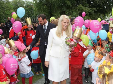 After the service in the Cathedral, the Royal Family walked to the park pavilion and on to Rektorhagen at Kongsgård. Here, 300 children from local kindergartens had been invited to a birthday party. The children greeted Queen Sonja with song, balloons and paper crowns. Many children had made their own gifts for The Queen.