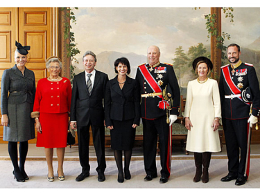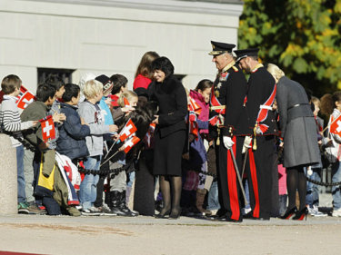 President Leuthard and Dr Hausin were formally welcomed to Norway by King Harald and Queen Sonja, their personal hosts during their visit, as well as by Crown Princess Mette-Marit. King Harald accompanied President Leuthard as she inspected the King’s Guard, and also took time to greet children in the Palace Square. The King then introduced the guests to representatives of official institutions in Norway.
