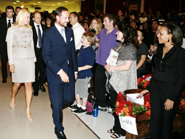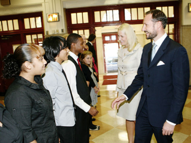 Crown Prince Haakon and Crown Princess Mette-Marit attended the performance together with 800 schoolchildren. Afterwards, they were escorted up onto the stage to meet the performers, musicians and children.