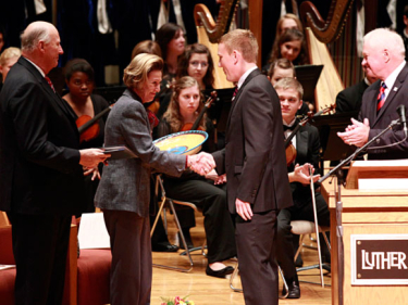 King Harald and Queen Sonja were presented with the Spirit of Luther Award in a formal ceremony at the Center for Faith and Life. The award “...recognizes individuals who have provided significant sustained service to the college. Nominees should be persons who have demonstrated a personal commitment to Luther’s mission, quality, and character.”