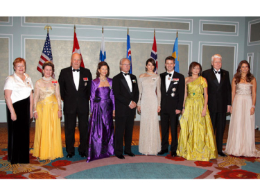 Their Majesties King Harald and Queen Sonja laid flowers on behalf of Norway. Sweden's bouquet was laid by Their Majesties King Carl Gustaf and Queen Silvia. Iceland was represented by President Ólafur Ragnar Grímsson and Dorrit Moussaieff, and Finland by President Tarja Halonen. Denmark’s bouquet was laid by Their Royal Highnesses Crown Prince Frederik and Crown Princess Mary.
