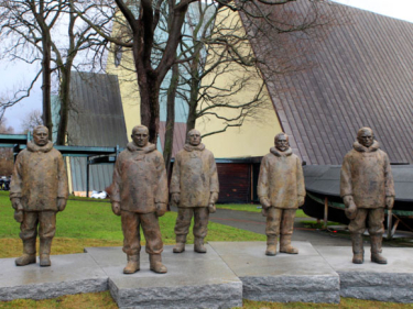 The monument immortalising the five Norwegian explorers is the work of sculptor Håkon Fagerås. Cast in bronze and nearly two metres high, the men stand on slabs of granite. The figures are based on photographs taken during the expedition, and are roughly hewn to reflect the extremely harsh conditions that the men had braved. The monument captures the solemn moment when Amundsen and his crew stood, hats in hand, facing their tent and the flag they planted at the South Pole point.