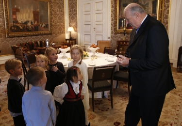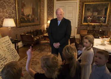 The children were greeted by the King in the Cabinet Parlour. There they presented their constitution to King Harald, and explained the various articles and the thinking behind these.