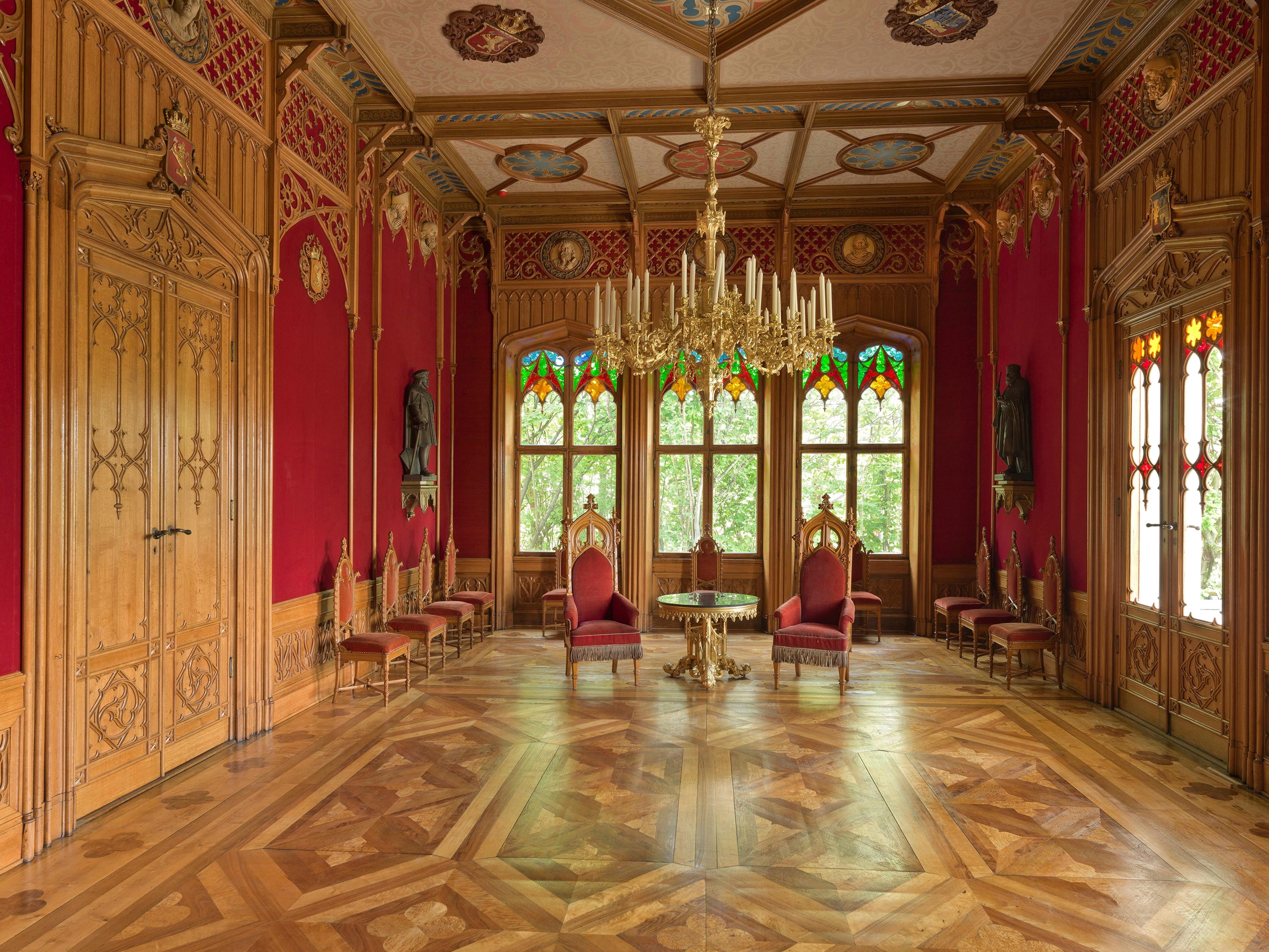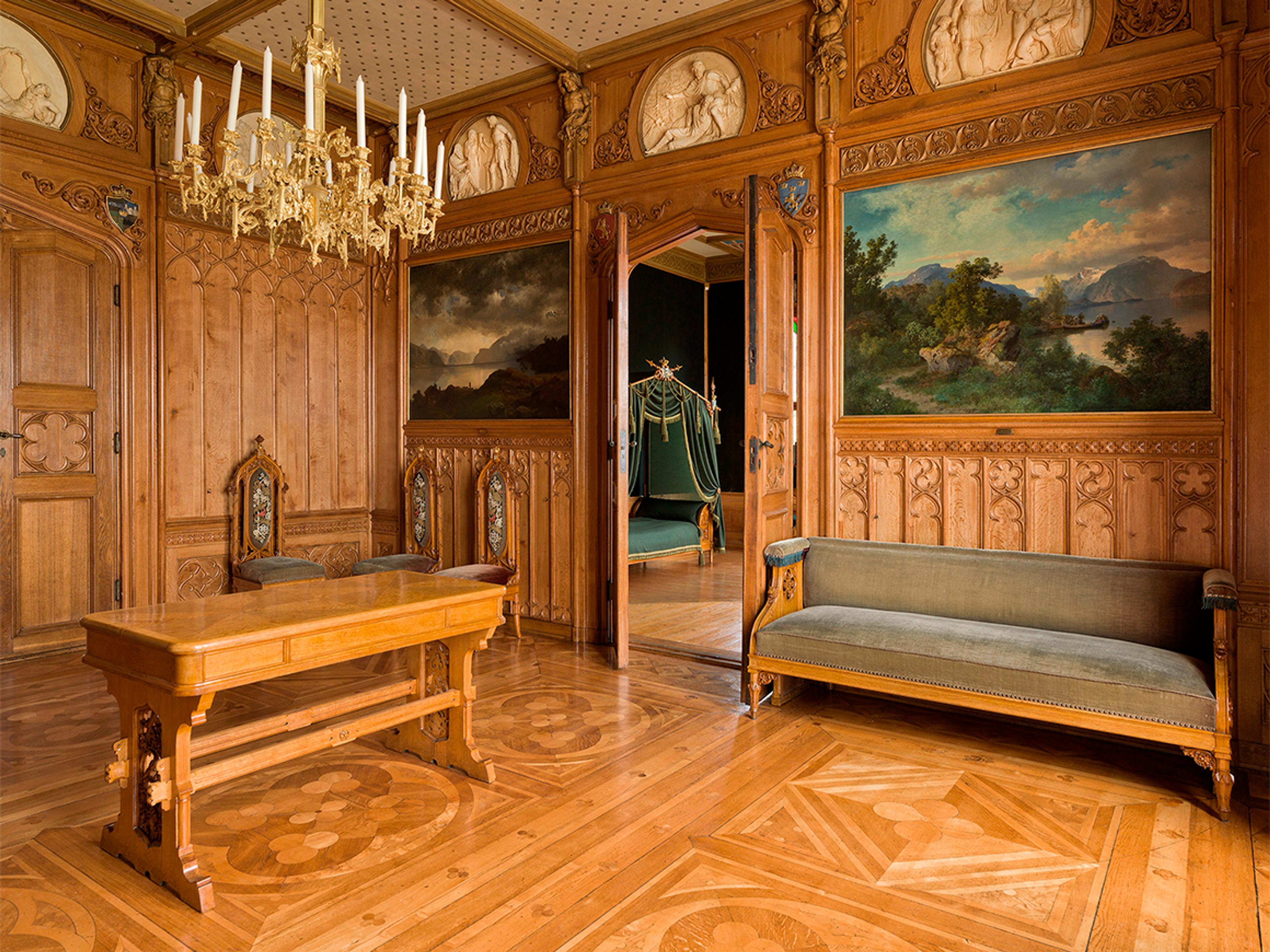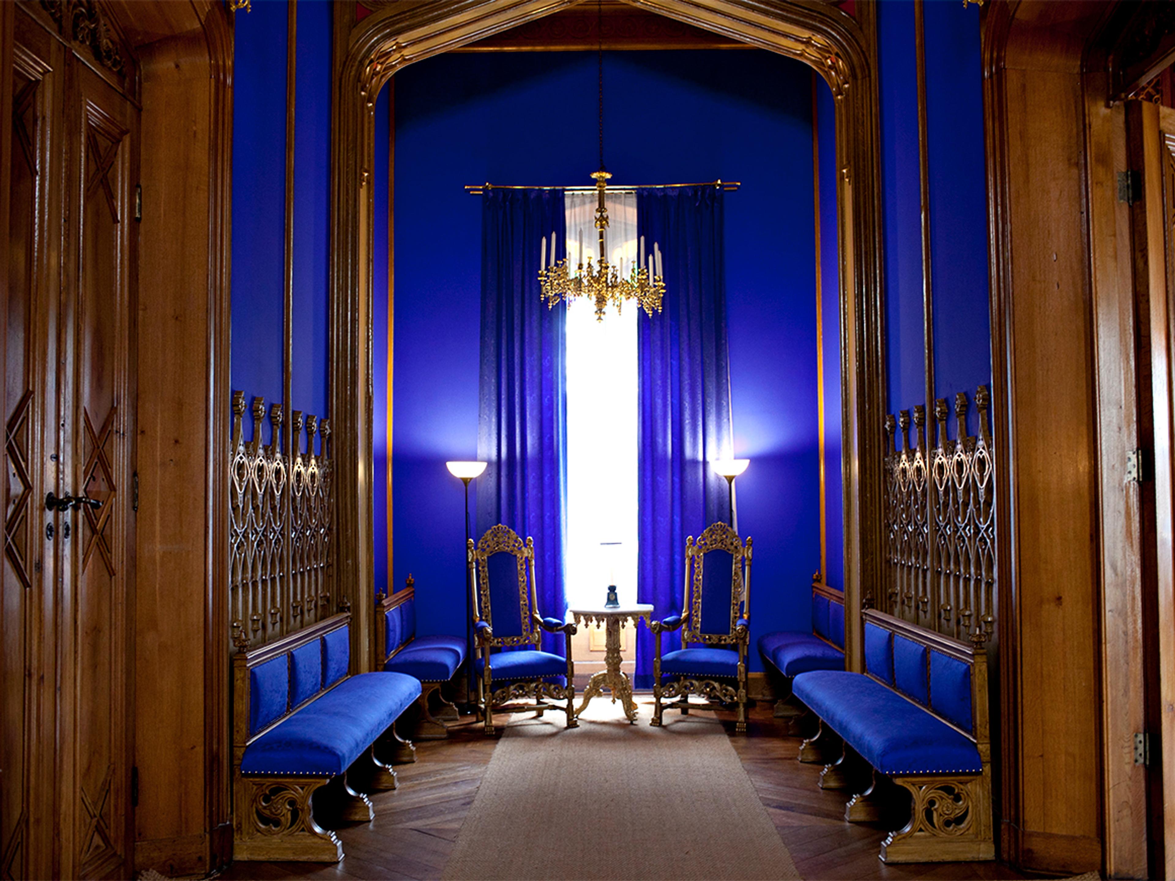 Upon entering Oscarshall, you are greeted by the intensely blue vestibule, where the rose window lends the space an almost sacred atmosphere. The adjoining salon is decorated with carved figures inspired by Norwegian medieval art.