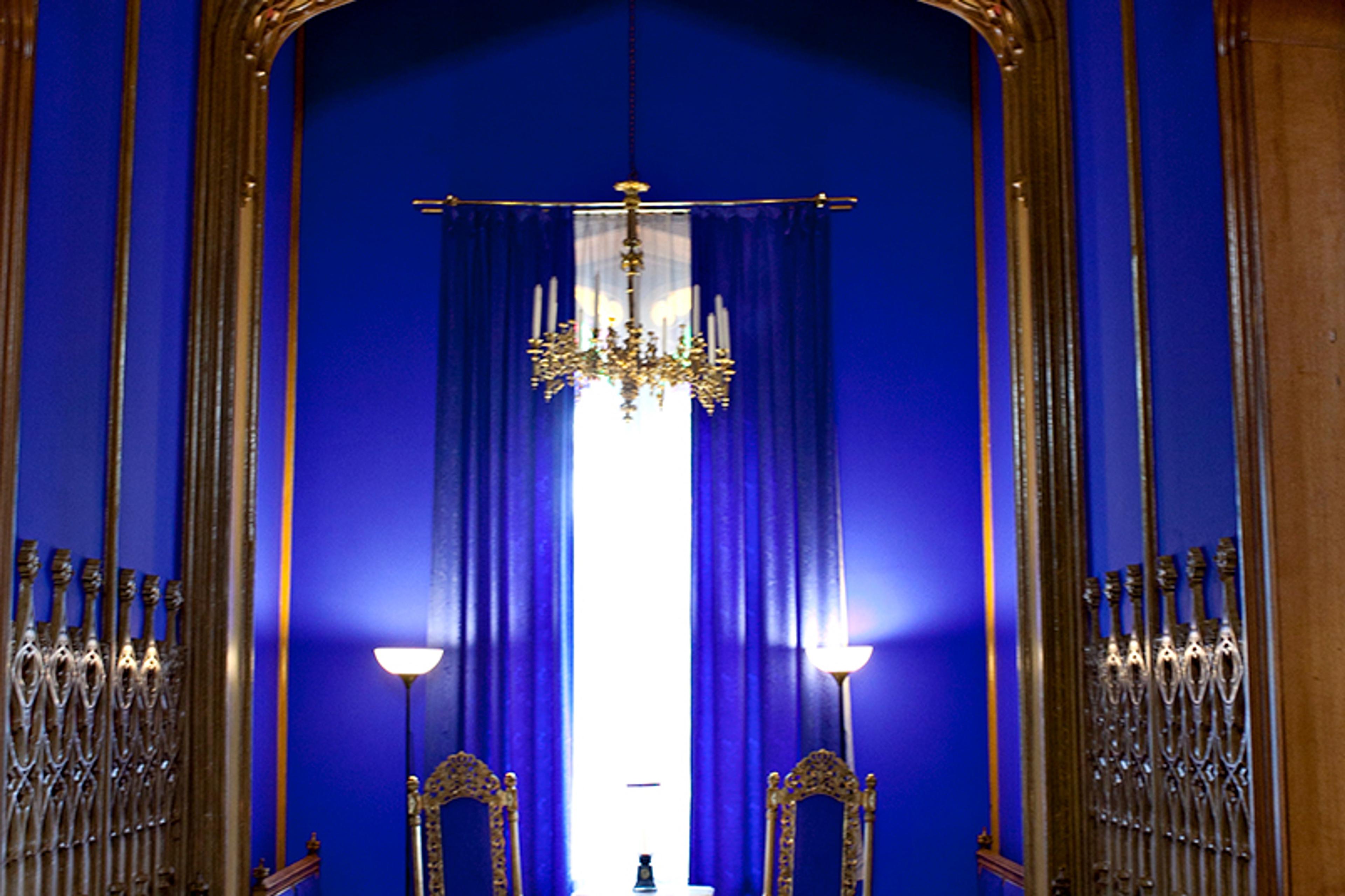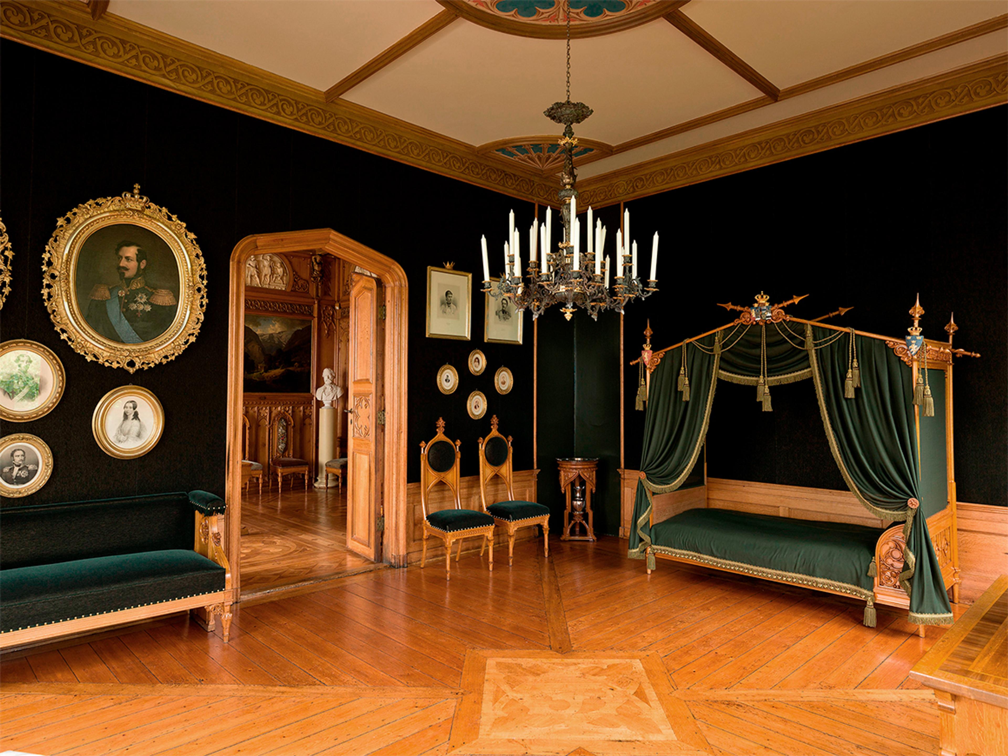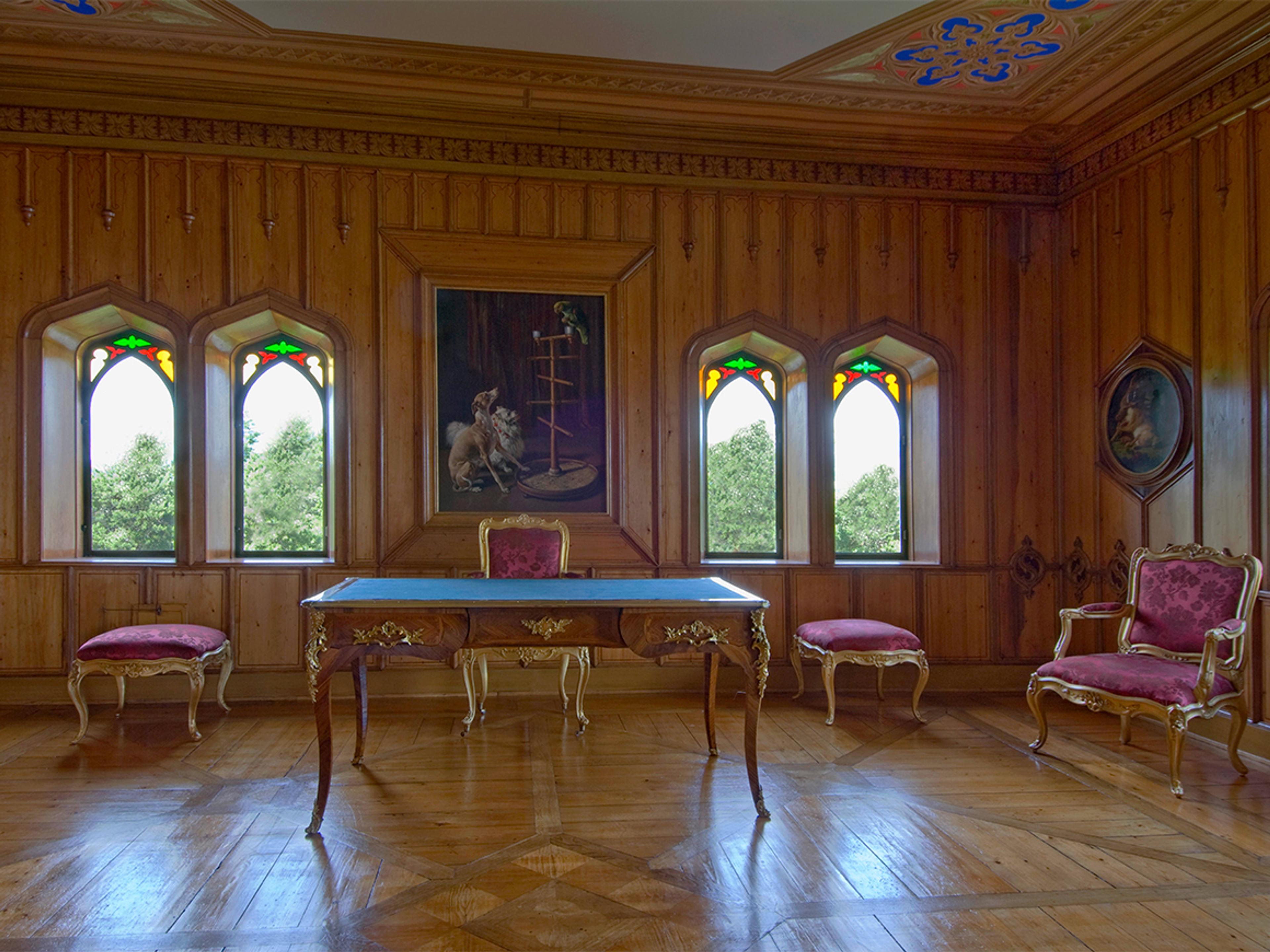 Upon entering Oscarshall, you are greeted by the intensely blue vestibule, where the rose window lends the space an almost sacred atmosphere. The adjoining salon is decorated with carved figures inspired by Norwegian medieval art.